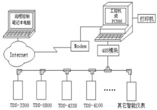 操作站到適配器之間采用高速串行或多串口通信。傳輸距離不大于20米。適配器到儀表之間采用RS485總線網絡型或RS232一一對應輻射型。傳輸距離不大于1500米。