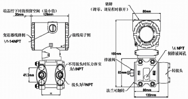 例:TDSB3051差壓變送器,量程0-300kpa,兩線制4~20 mA DC信號輸出,法蘭接頭、排氣/排液閥、隔離膜片均為316不銹鋼,智能表顯示器,管裝平支架,泄放閥在壓力室側面的上部,橢圓接頭內螺紋NPT 1/2